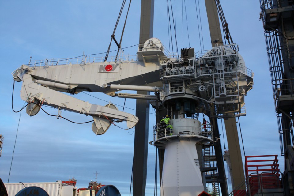 MT6016 design “Skandi Neptune” has recently completed a rebuilding at Orskov Yard, Denmark. A new 250 Te offshore crane has been added on starboard side, replacing the old 140 Te crane on port side. Marin Teknikk AS has delivered the engineering package, including drawings and calculations for the job. The new 250 Te crane has a center of gravity as high as 16.5 m above shelter deck! To be able to integrate the crane foundation to the ship structure, a section of the ship had to be cut and replaced with a strengthened unit.